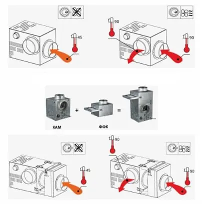 Наличие специального регулятора позволяет пользователю легко настраивать желаемые температурные параметры. В зависимости от этих параметров, вентилятор включается и выключается. При этом, диапазон температур поверхности камина, при которых вентилятор начинает работать, составляет 0°C — 90°C.