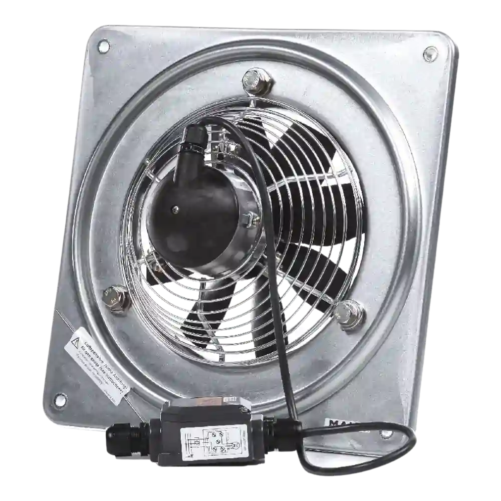 Однофазный асинхронный не реверсивный двигатель оборудован конденсатором, что расположен на стенной втулке, для защиты от перегрева используется встроенная серийная термозащита. Осевые настенные вентиляторы не предназначены для перемещения воздуха насыщенного паром.